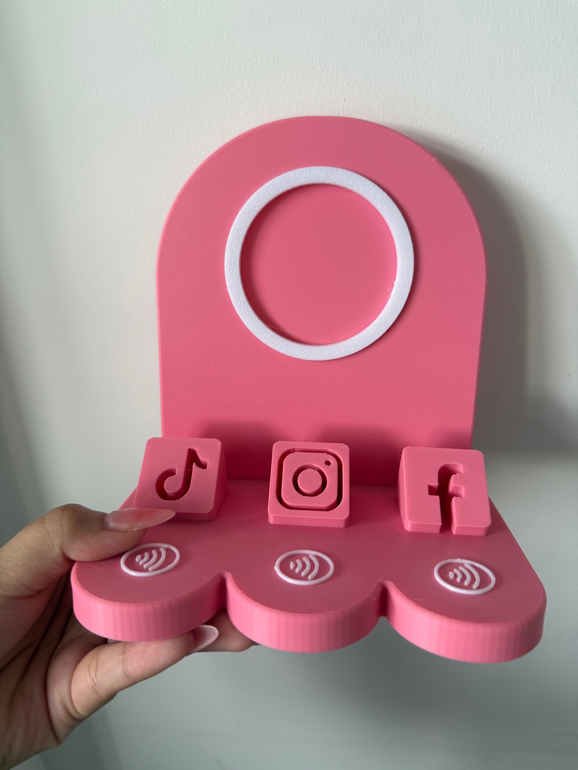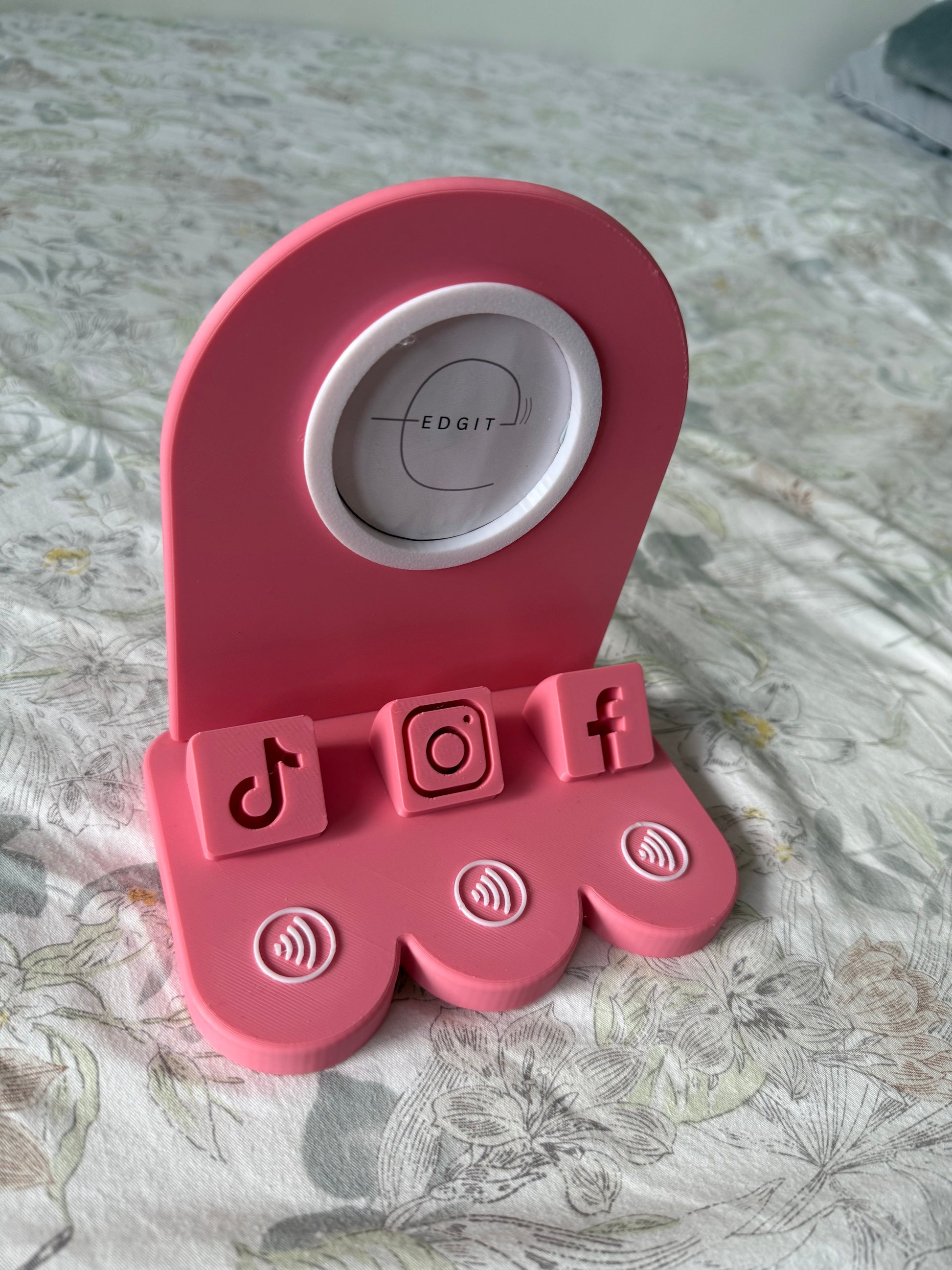 Please enter your social media links under "Enter your URL", and send a jpg/png file of your circular logo to edgitsales@gmail.com with your order number. Every item is made to order, so please order in advance to account for manufacturing time. Colour chosen is the base colour (eg. pink), the colour of the NFC signs and circle rim is standard white. If white is chosen, the colour of the NFC signs and circle rim will be black.